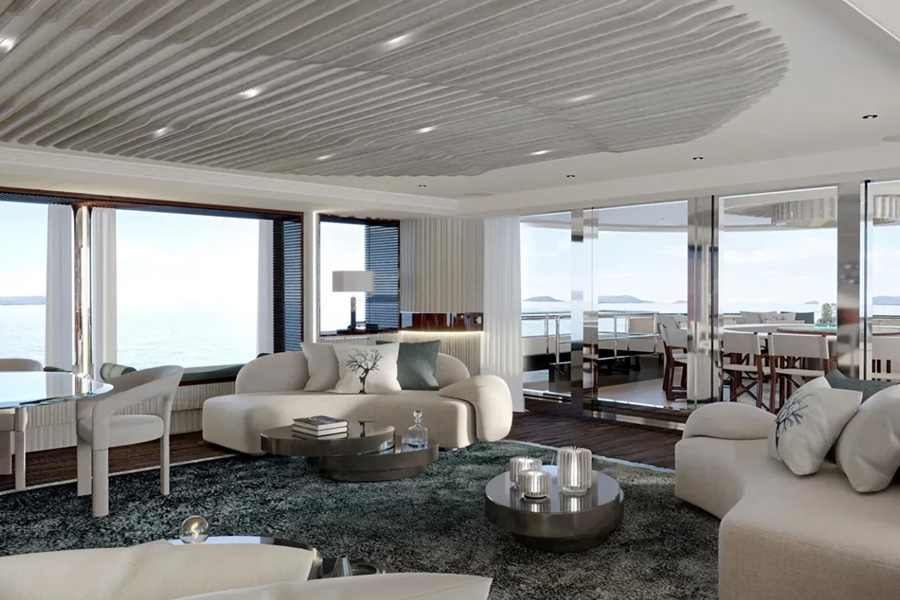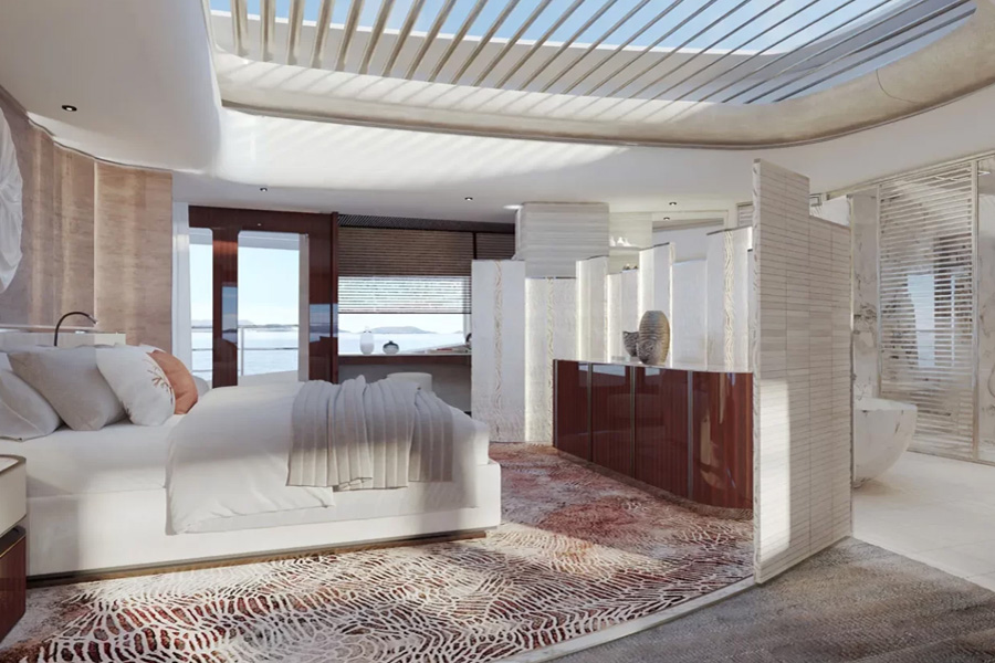 Romeo Marine describes the new model as a “concept of light and space”, tailored for both family cruising and sophisticated entertaining. This ethos comes to life in the yacht’s floor-to-ceiling glass panels, double-height ceilings, and seamless indoor–outdoor connections. A skylight above the owner’s suite adds to the natural illumination and sense of openness throughout.