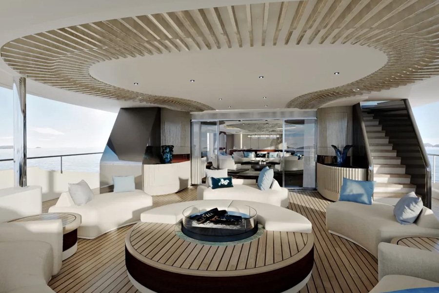 Among the yacht’s standout features is a sculptural spiral staircase with a panoramic lift connecting all decks. The sundeck acts as the social heart of the yacht, complete with a pool, bar, and barbecue area. Meanwhile, the upper deck offers flexibility, converting into a fully equipped gym when required.